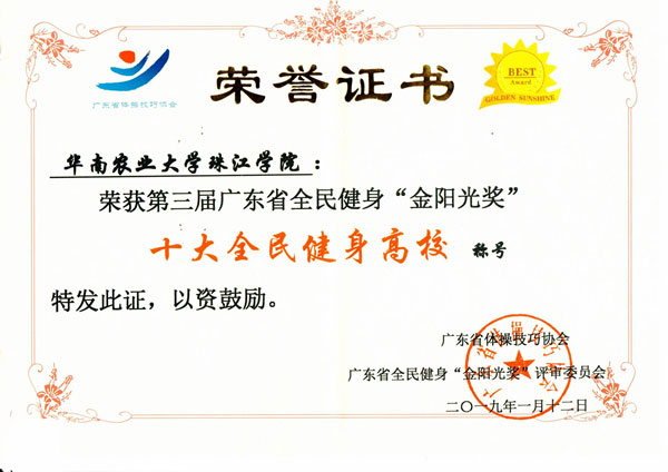 1月12日,“2018年广东省体操技巧协会年会暨第三届广东省全民健身‘金阳光奖’”颁奖典礼在广州体育职业技术学院举行,广东省体育局副局长、广东省体操技巧协会主席林瑛出席并讲话。华珠再次荣膺广东省全民健身“金阳光奖”十大全民健身高校大奖,简妮娜、朱荣平、邓芊婷、何蜓蜓获得优秀教师/教练员称号。